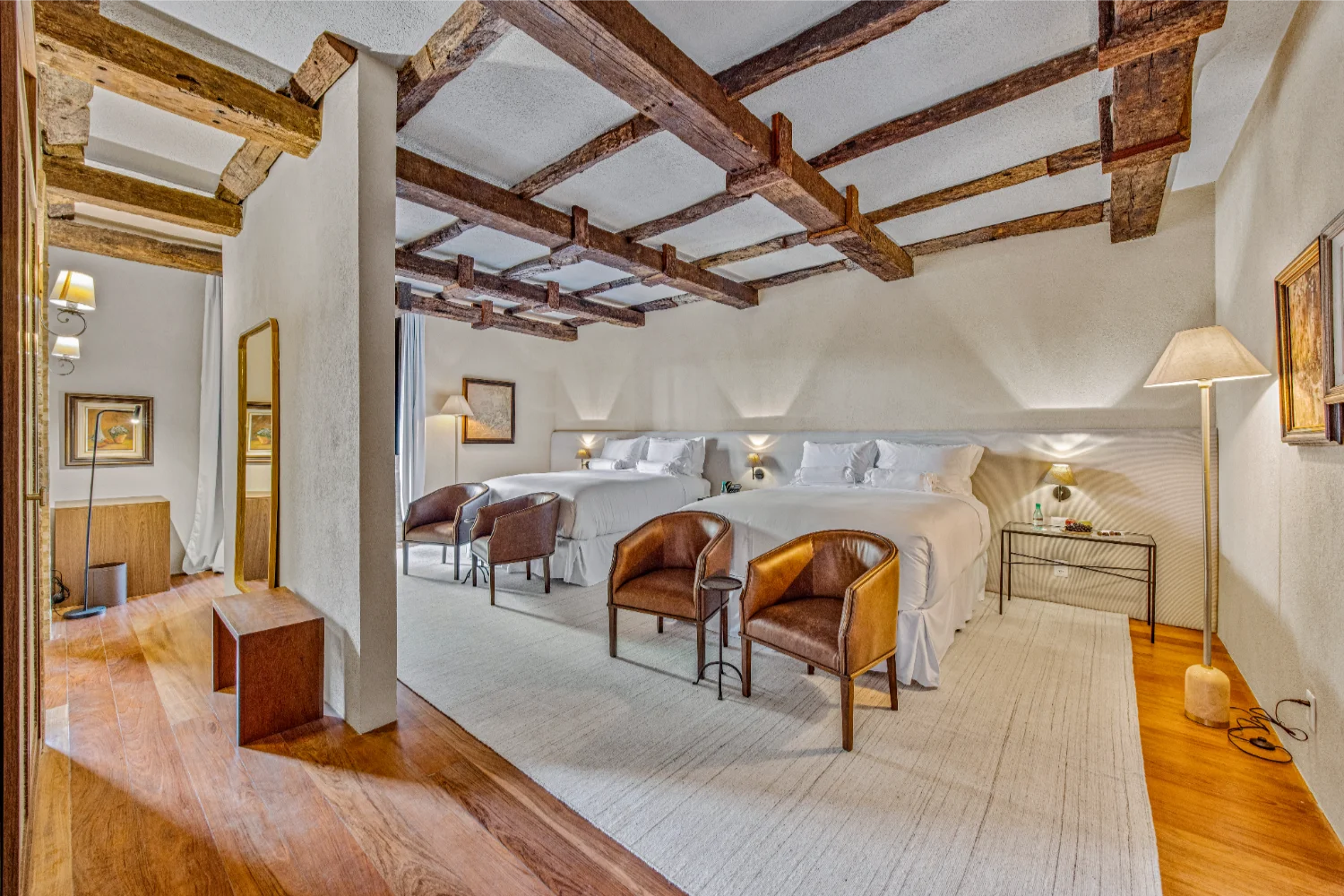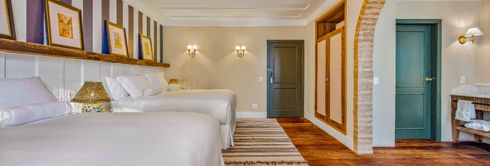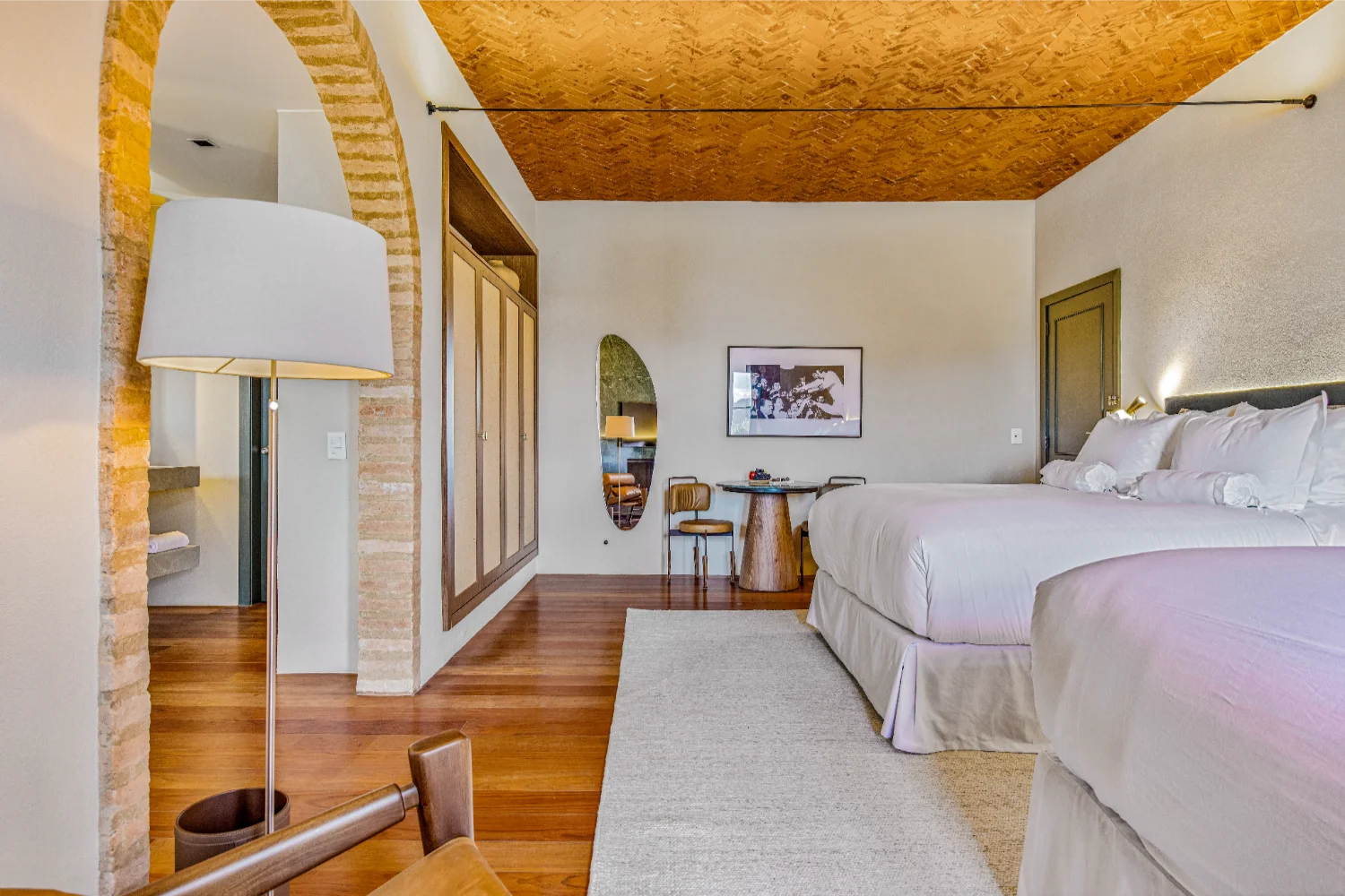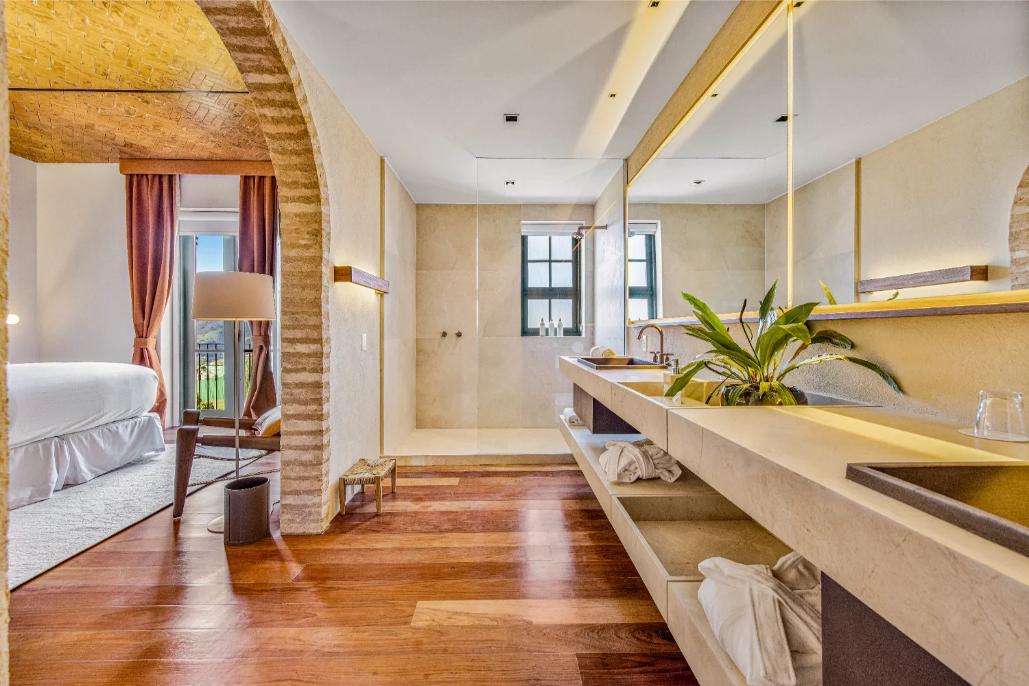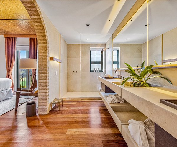 Com 45m² e duas camas queen size, ideal para quem viaja em família ou busca mais espaço para o descanso. O projeto valoriza o contraste entre linhas modernas e materiais naturais: a presença da madeira aquece o ambiente. Da varanda, a vista para o jardim convida à contemplação da paisagem, tornando experiência ainda mais memorável.